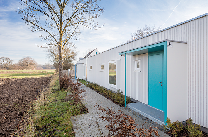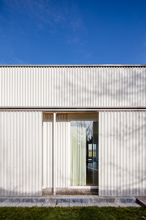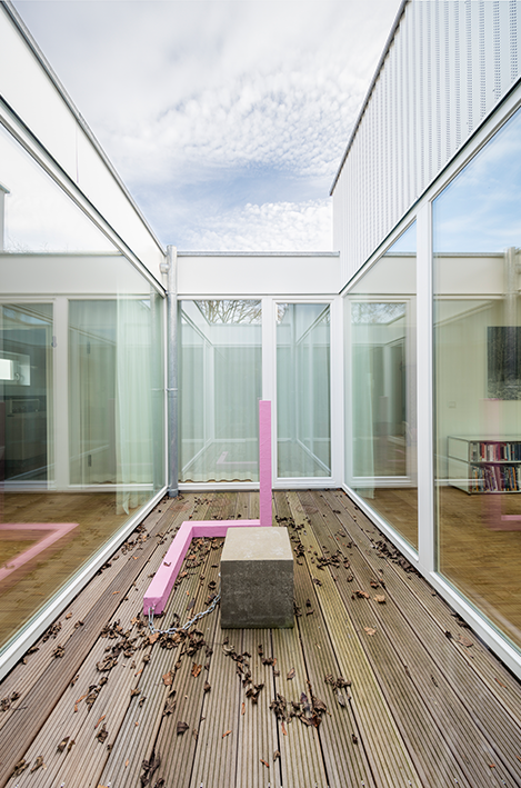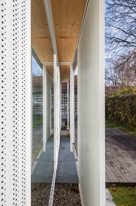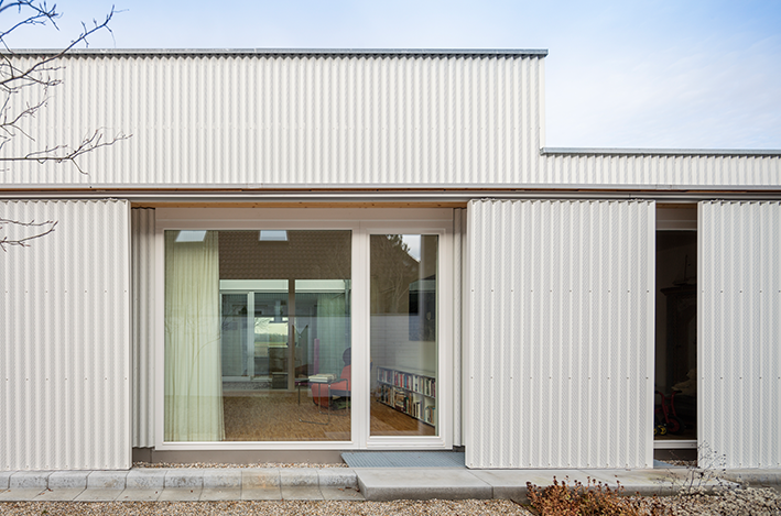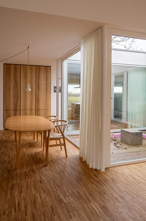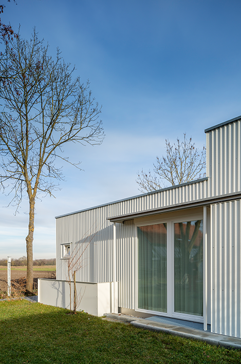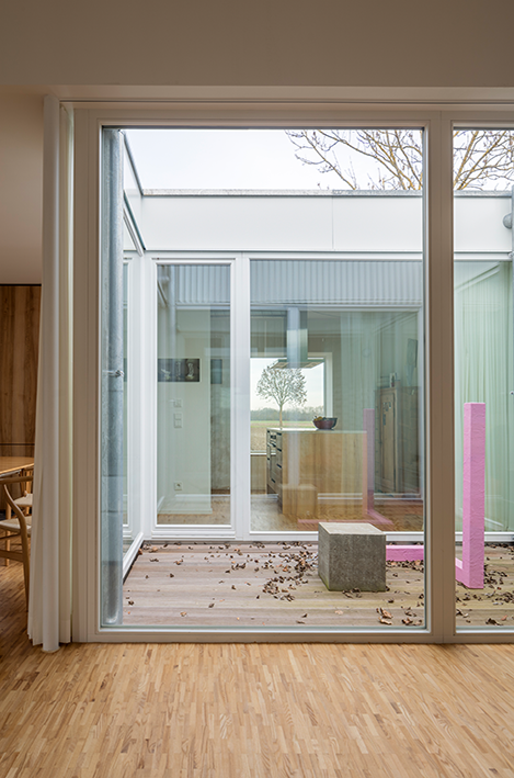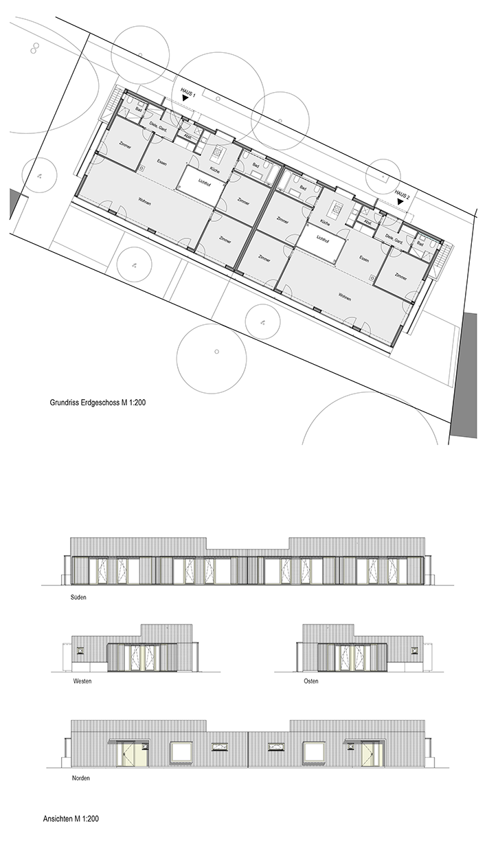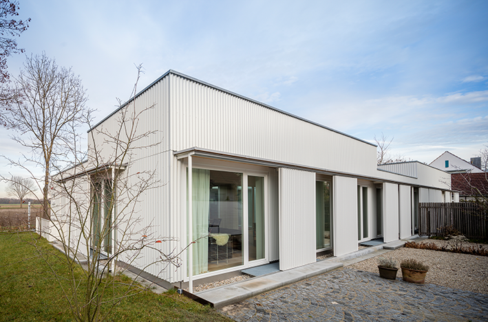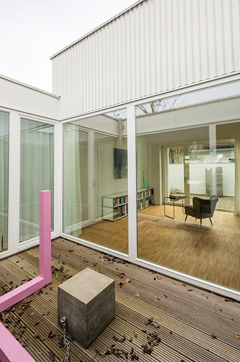 Auf schmalem Grundstück am Ortsrand eines Dorfgebiets enstand in 2. Reihe ein Doppelhaus in erdgeschossiger Bauweise. Der Grundtypus mit 10/15m wurde gedoppelt und gespiegelt. Um einen mittigen Lichthof gruppiert sich der offene Grundriss. Auf Hierarchien und Raumwidmungen wurde bewusst verzichtet um eine Flexibilität in der Nutzung zu gewährleisten. Bei Entfernung nichttragender Zwischenwände lässt sich ein Großraum-Kontinuum herstellen. Lediglich eine schmale Raumachse an der Nordseite enthält sanitärabhängige Räume wie Bad, Küche, Nasszelle und Hauswirtschaftsraum. Die Wohnraumachse im Süden ist um 1m höher als die übrigen Räume, sodass sich eine Höhenstaffelung im ansonsten gleichmäßig flachen Gesamtkomplex ergibt. Die Abstands-flächenregelung der BayBO hat hier maßgeblichen Einfluss.