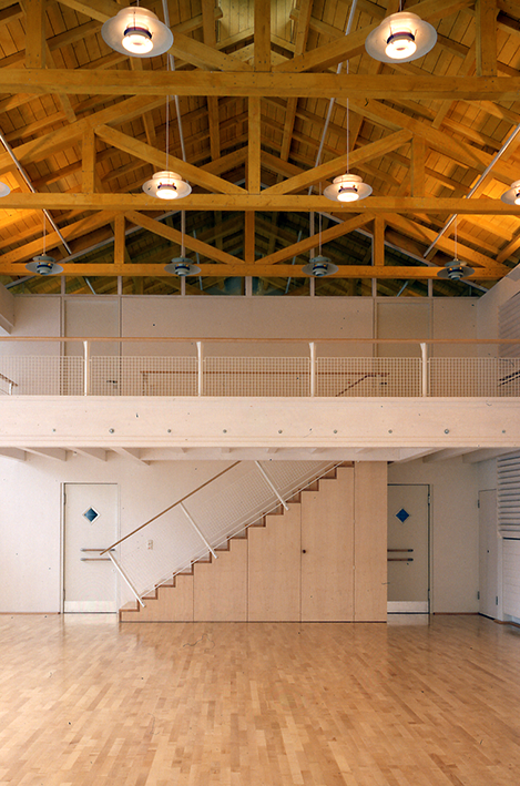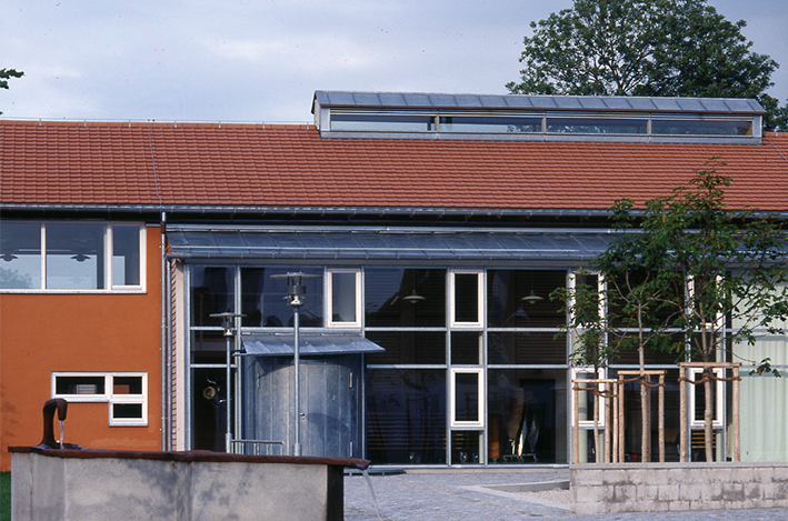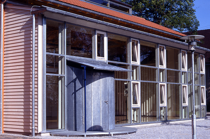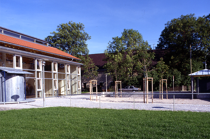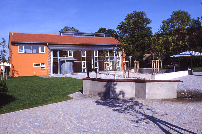 Die Ortsmitte erfährt durch kommunale Einrichtungen wie Bürgersaal und Feuerwehr eine neue Prägung. Dörflichen Aktivitäten wird Raum und Ausdruck gegeben. Maibaum, Wartehäuschen, Brunnen, Dorfplatz mit Kastanien geben den Rahmen für den Bürgersaal, der wie ein öffentliches Schaufenster die Aktivitäten im Inneren transparent macht.