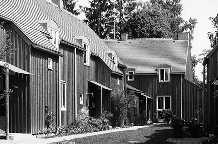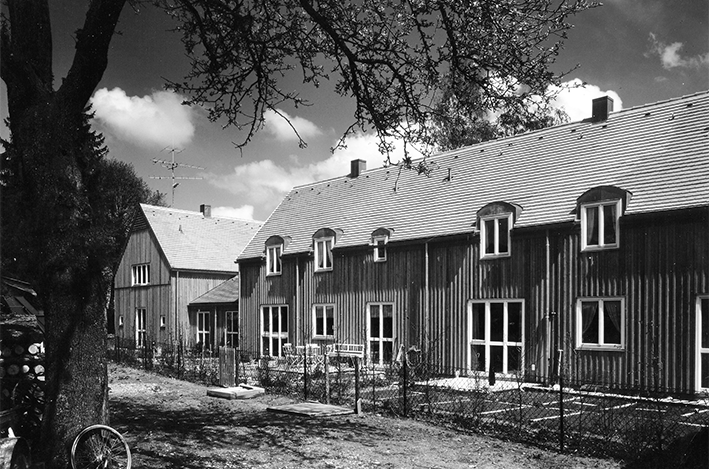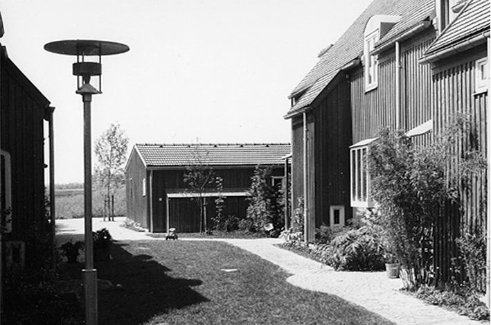 Die Nachbarschaft zu landwirtschaftlichen Baustrukturen bestimmen Form und Gestalt der kleinen Wohnanlage. Schmale Haustypen sind um einen Innenhof gruppiert und zu einer Hausgruppe verkettet. Verdichtetes, individuelles Wohnen, Gemeinschaft und zugleich Privatheit kommen den Bedürfnissen nach Wohnen in Dörfern im Stadtumland entgegen.