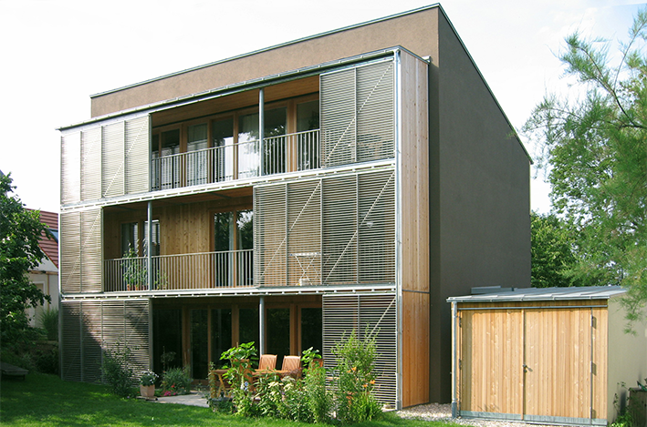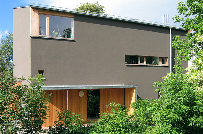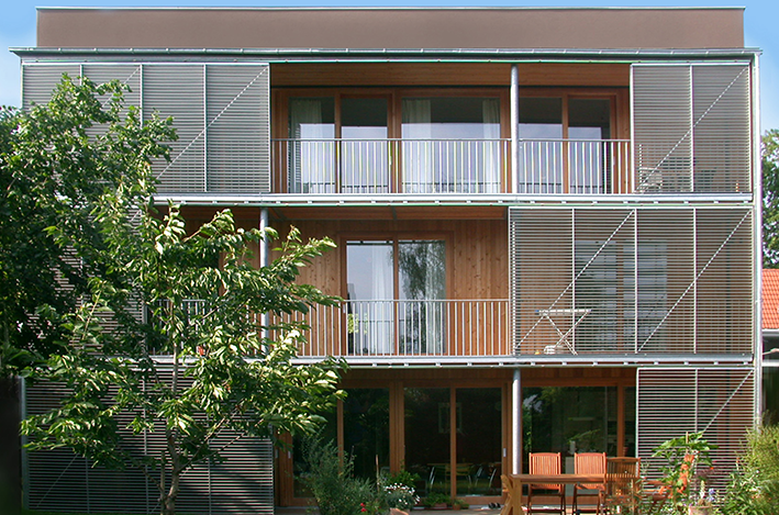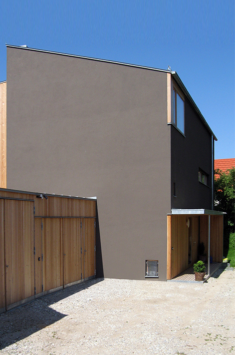 In einer Isardamm-Senke zwischen Wohnhäusern unterschiedlicher Ausformung steht in zweiter Reihe ein Einfamilienhaus mit Nebengebäuden. Der schlanke Baukörper und seine Situierung ermöglicht die Ausrichtung aller Aufenthaltsräume nach Süden und zum Gartenbereich. Der Südseite wurde eine 3-geschoßige Loggia vorgelagert, die mit ihren beweglichen Schiebelamellen immer wieder wechselnde Fassadeneindrücke ermöglicht.