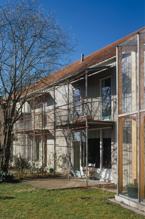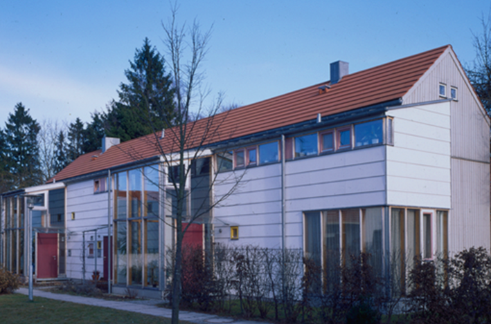 Die nahe lärmauslösende Bundestraße 11 führt zu einer besonderen Grundrißlösung bei der die der Lärmquelle zugewandten Nebenraumzonen die Aufenthaltsräume und Gärten abschirmen und auch der dahinterliegenden Wohnbebauung Schutz bieten. Dem Doppelhaus ist eine Einliegerwohnung zwischengeschaltet, die wechselseitig nutzbar gemacht werden kann.