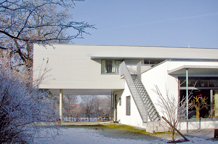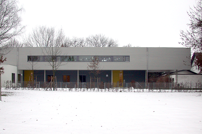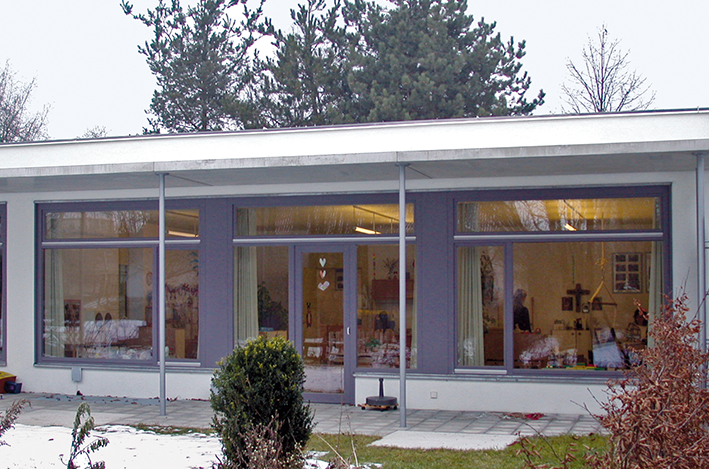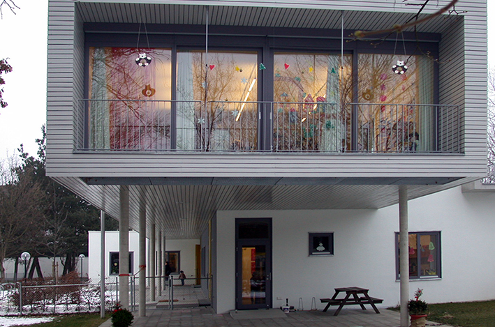 Kindergarten und Hort sind Teil eines Pfarrzentrums aus dem Jahr 1968. Im Zuge der Generalsanierung wurden Erschließung, Grundrisse und Nutzung neu geordnet. Fehlendes Raumprogramm und ehemalige Kellernutzungen wurden in eine Teilaufstockung gepackt und mit dem Bestand verknüpft. Das Neue versteht sich als Teil des Ganzen und schreibt die Architektursprache der Entstehungszeit fort.