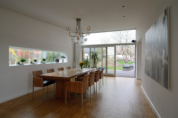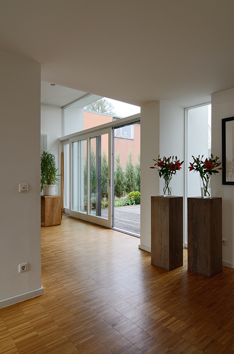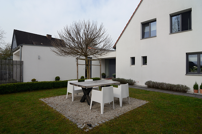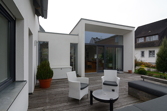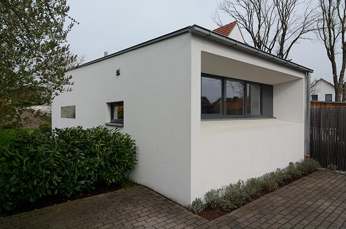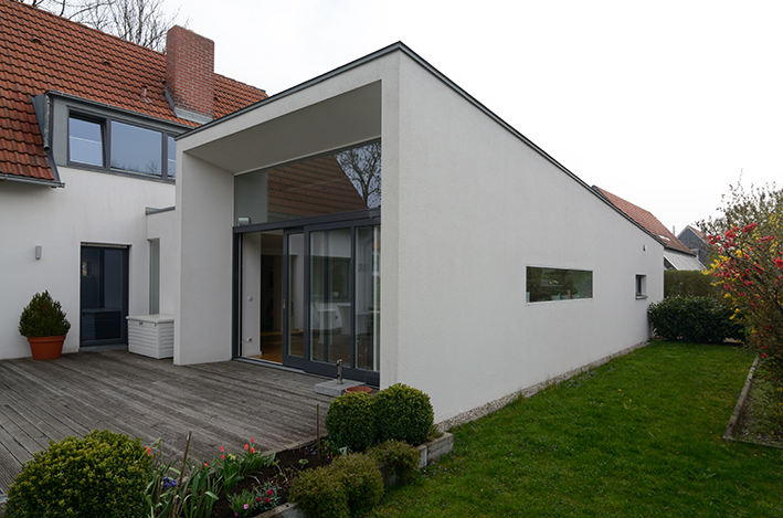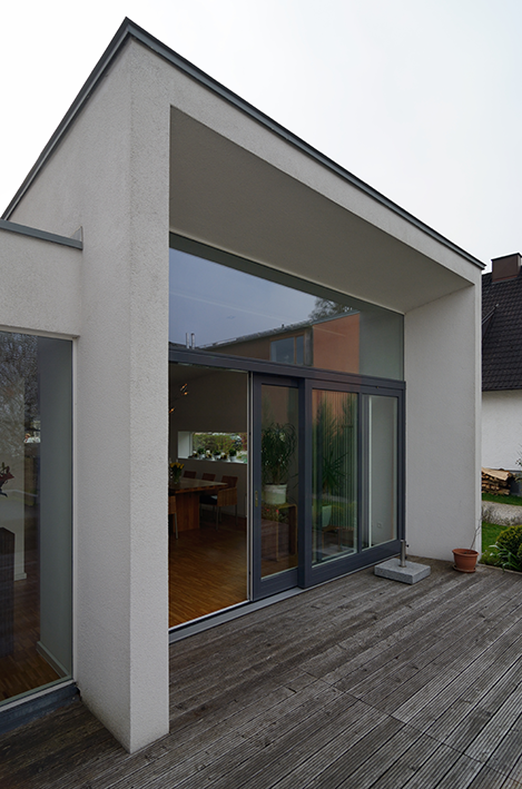 Ein Einfamilienhaus aus den 70er Jahren musste saniert und neuen Bedürfnissen angepasst werden. Durch den Abbruch einer Garage entstand neuer Bauraum. Ein erdgeschoßiger Anbau mit Pultdach erweitert die Wohnfläche um eine Küche und einen Wohn- / Essraum, der auch als eigenständige Wohneinheit genutzt werden kann. Wohnterrasse im Westen und Eingangshöfchen im Osten ergänzen das Wohnangebot im Freien.