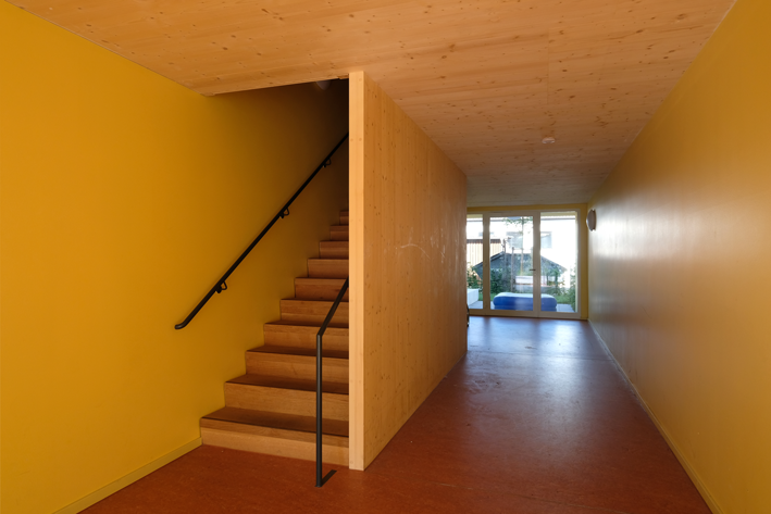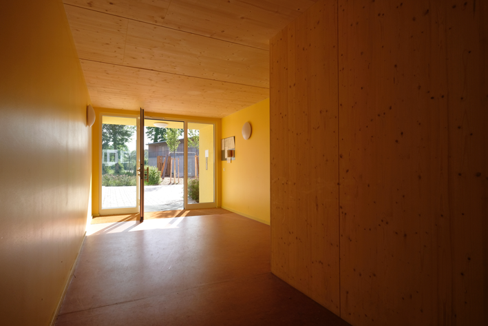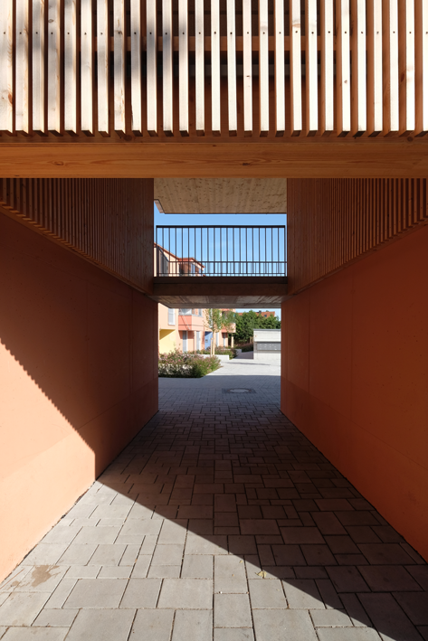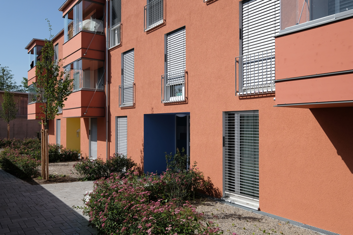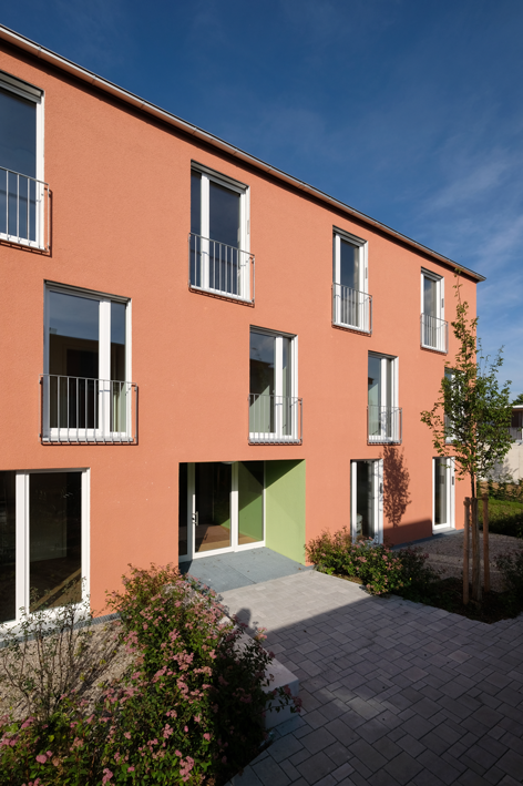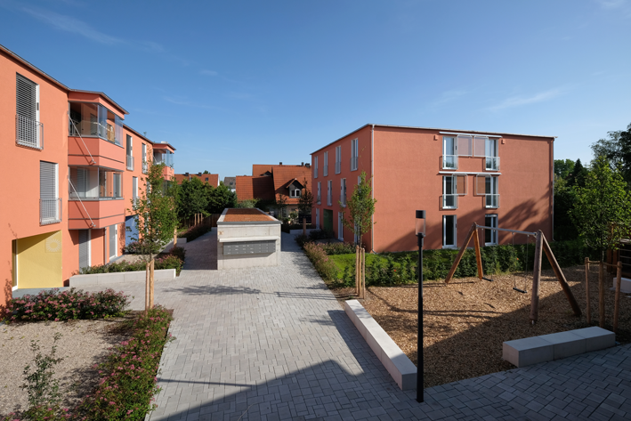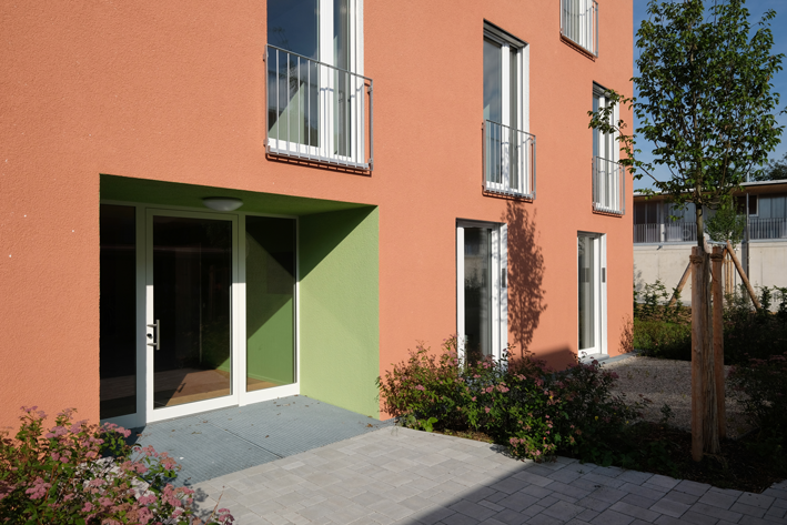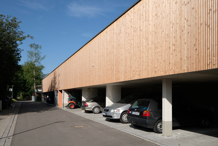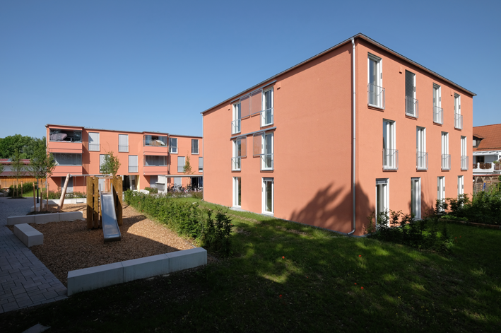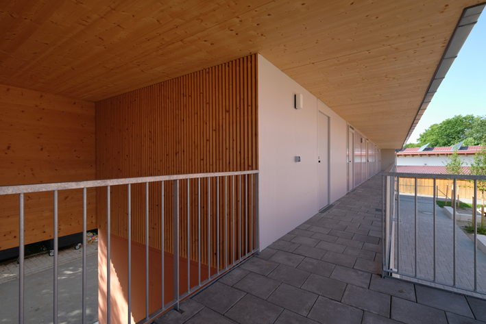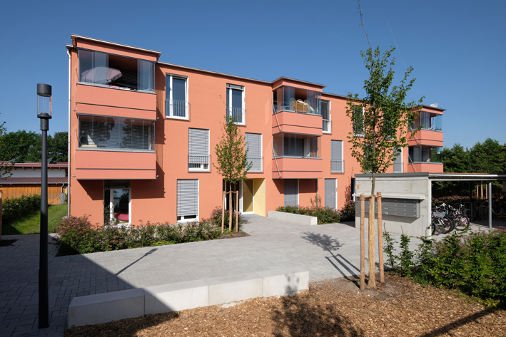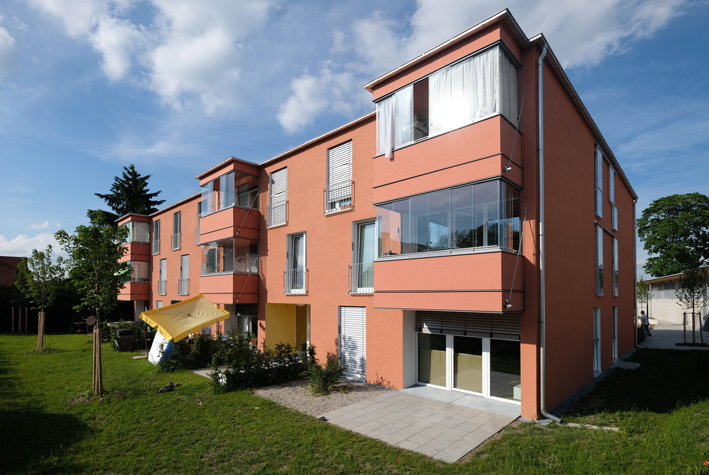 In unmittelbarer Nähe zur stark frequentierten Bahnstrecke München/Landshut sind unter Einhaltung von hohen Schallschutz-Anforderungen 15 Wohnungen im sozialen Wohnungsbau und 12 Einfachwohnungen für vorübergehenden Aufenthalt entstanden. Ein vorgestellter 2-geschossiger Gebäuderiegel mit Carports im EG und Kellerersatzräumen im OG ist eine Maßnahme gegen Bahnlärm und Erschütterungen. Die vorgefertigte Holzbauweise führte zu kurzen Bauzeiten und ökologischen Vorteilen. Gegen die Erschütterungen durch den nahen Bahnkörper sind die Gebäude schwingend gelagert. Unter Verzicht auf Balkone/Loggien sind die Einfachwohnungen auf die notwendigsten Flächen reduziert.