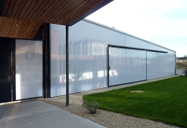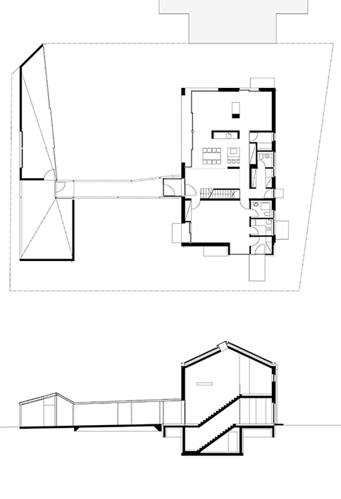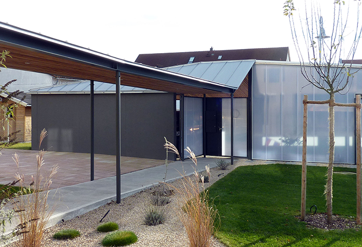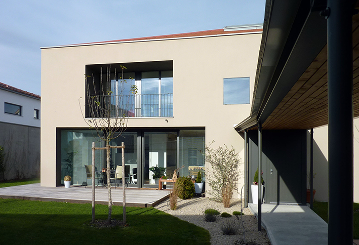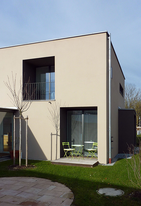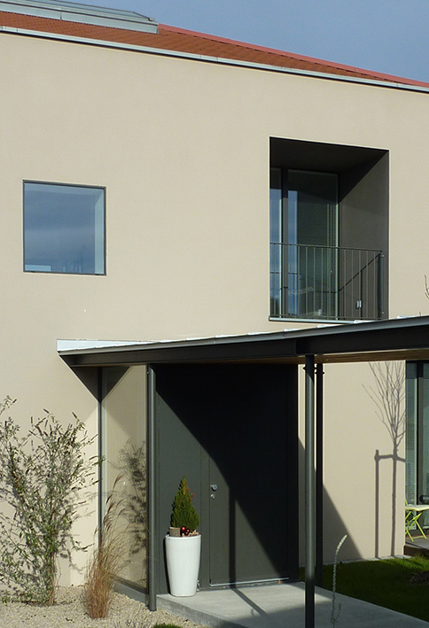 Im Rahmen eines qualifizierten Bebauungsplans mit gestalterischen Festsetzungen entsteht ein Einfamilienhaus mit Einliegerwohnung als 2-Generationenhaus. Ein Nebengebäude entlang der Erschließungsstraße mit Carport und Freizeiteinrichtungen schafft einen Binnenraum und schirmt negative Einflüsse der südlichen Nachbarschaft wirksam ab. Massivbau mit plastischer Ausformung der Außenhülle durch Loggien, Terrasse und Erker. Hoher technischer Standard, niedriger Energiebedarf.